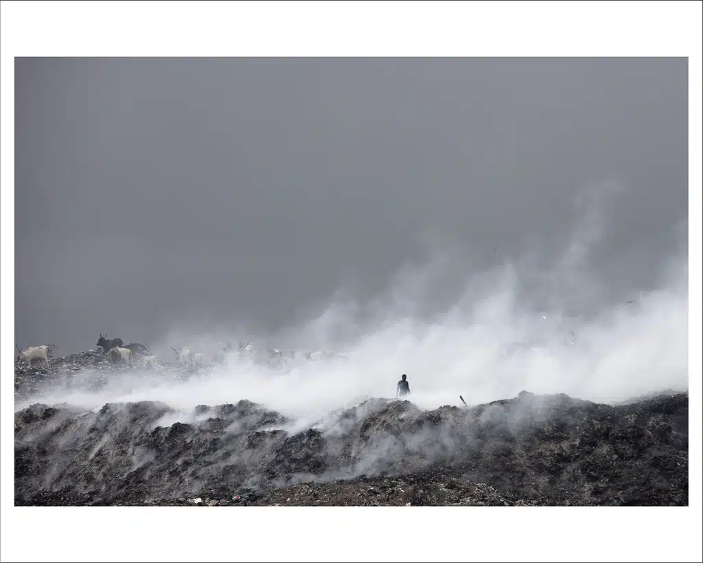 A mostra também aborda a prática do colonialismo de resíduos, em que países desenvolvidos exportam lixo industrial para países em desenvolvimento, revelando uma dura realidade de desigualdade social e ambiental, amplamente observada desde os aterros de Gana até os desertos do Oriente Médio.