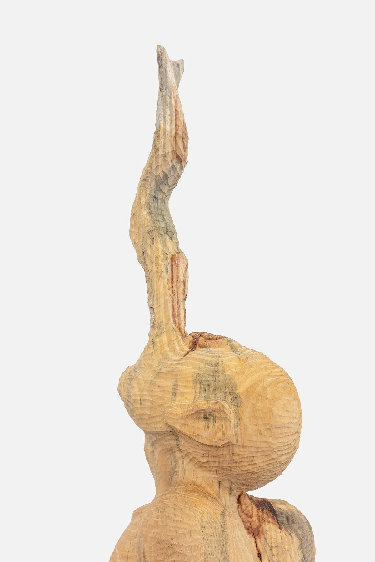 Dentre as madeiras trabalhadas pelo artista estão o pinus, oitis, o roxinho – muito usada como cabo de enxada pela sua dureza, e o eucalipto. Esta última, uma conhecida espécie exótica plantada para o beneficiamento de celulose, é recolhida por Zé Carlos no processo de restauração da mata do seu sítio, onde substitui a árvore “invasora” por uma muda nativa, em um ato reparador tanto ecológico como simbólico.
