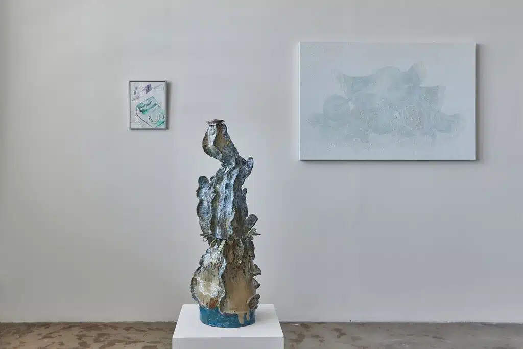 Ao final de seu texto “The Carrier Bag Theory of Fiction”, parte do livro Dancing at the Edge of the World (1989) – título traduzido livremente e adaptado para nomear essa exposição–, Ursula K. Le Guin nos conta que a ficção científica, por mais engraçada ou fantasiosa, é uma tentativa de descrever o que de fato está acontecendo numa determinada época, o que as pessoas realmente fazem e sentem, e de como elas se relacionam com o mundo. As obras aqui reunidas estão informadas por reflexões sobre o agora, consequência do nosso passado e prenhe do nosso futuro e, várias delas, podem ser consideradas ficções descritivas da nossa realidade. Concebidos em sua maioria entre 2020 e 2023, ou seja, num período pandêmico ou pós-pandêmico, os trabalhos estão informados de um imaginário carregado de uma possibilidade de não-existência ou de um não-futuro.