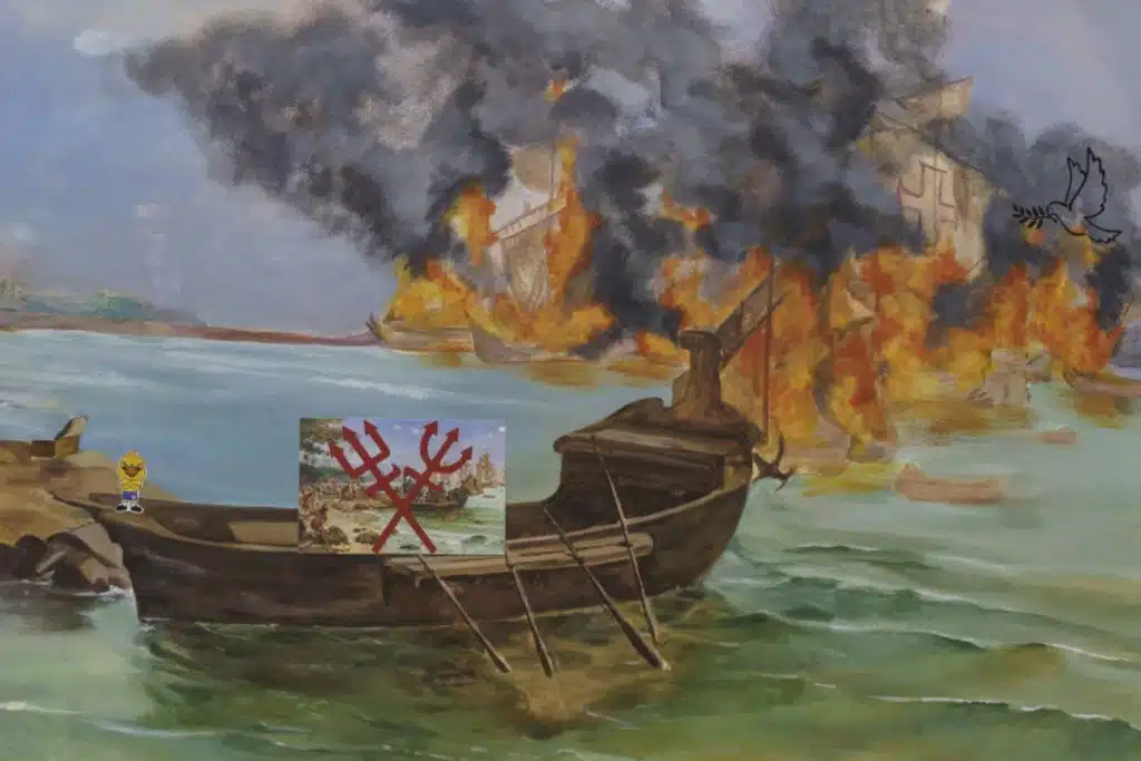 Invasão de Pedro Álvares Cabral em Porto Seguro em 1500 também é um desdobramento de uma pesquisa que Jaime Lauriano vem realizando desde 2022. Neste grupo de trabalhos, o artista faz uma releitura de pinturas acadêmicas produzidas entre a segunda metade do Século XIX e início do Século XX, que representam de forma idealizada fatos da História do Brasil, em geral colocando agentes colonizadores em poses heróicas. A tela do trabalho em questão é uma pintura datada de 1900, pintada por Oscar Pereira da Silva, que representa a chegada dos primeiros portugueses ao que viria hoje ser o território brasileiro. Jaime esvazia a cena de pessoas e personagens, mantendo apenas o cenário e inserindo nele uma profusão de stickers, que ora aludem a violência colonial, ora a elementos de resistência. Acima, na moldura, miniaturas de soldados e figuras populares ligadas a religiões de matriz afro, como o Zé Pilintra³, aparecem dispostos de maneira a simular um combate.