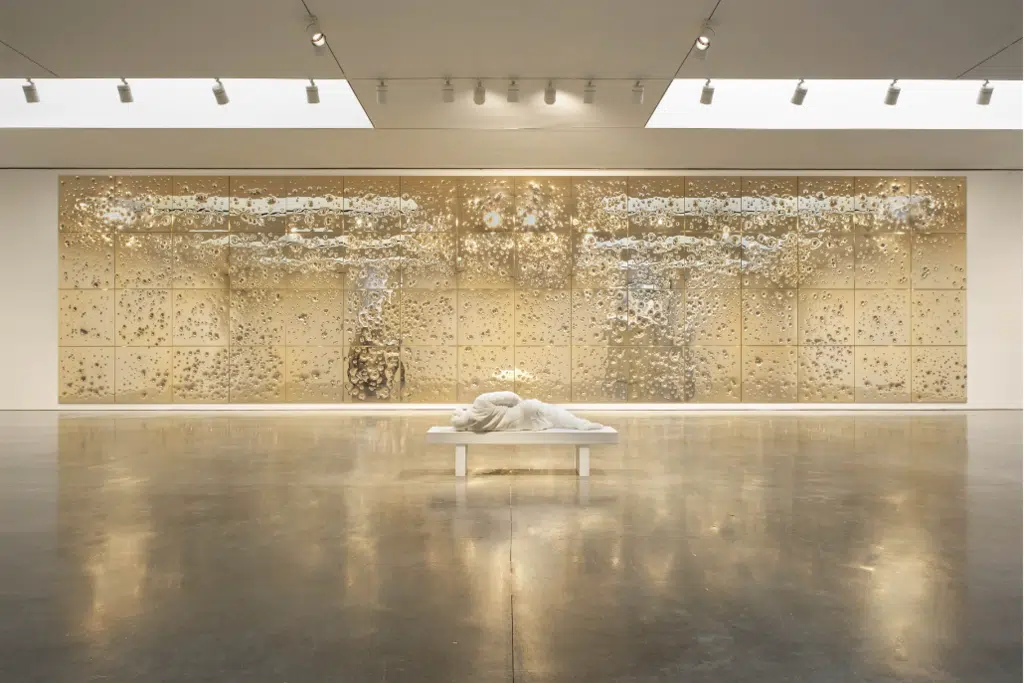 Os visitantes são imediatamente confrontados por uma parede imponente de 17 pés de altura, composta pelos painéis dourados que se estendem por cerca de 68 pés de largura. Em frente a isso está November (2024), uma fonte de mármore que retrata uma figura reclinada urinando no chão. Cattelan caracteriza a obra como “um monumento à marginalidade”, uma imagem de uma realidade que habitualmente ignoramos. Ecoando Manneken Pis (1619), uma famosa escultura pública de um menino urinando em uma fonte, ela apresenta ao espectador uma transgressão desconfortável das normas sociais. Mas, como Bonami demanda, “Se você é livre para comprar um fuzil de assalto em uma loja de departamento, o que há de errado em urinar em público?”