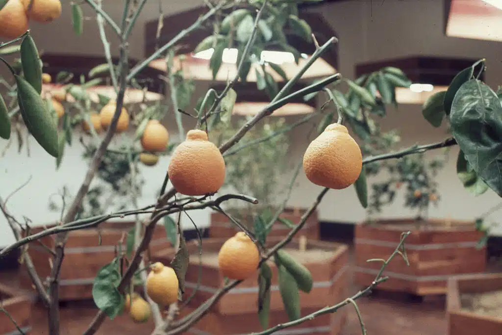 The Harrisons, Survival Piece #5: Portable Orchard, 1972–73 (vista da instalação, Art Gallery da California State University, Fullerton) © Helen and Newton Harrison Family Trust. Cortesia de Various Small Fires, Los Angeles/Dallas/Seoul.