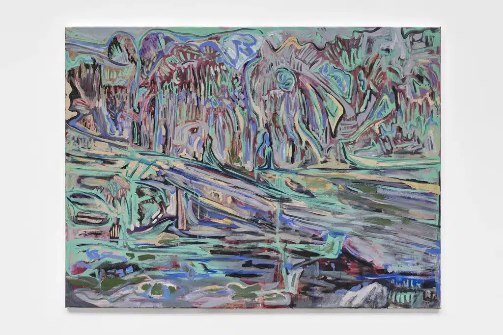 Caracterizadas por cores ousadas e fauvistas, as pinturas de Ahmad fundem espaço agregado com abandono gestual inquieto, dentro das quais tramas estruturais mais intencionais emergem. Marcas lineares sinuosas, criadas através de impressões mais finas de pastel branco, carvão e tinta, traçam o padrão vegetal de folhagens e flora nativas da região, segmentando naturalmente as composições em zonas gestuais e tonais, onde interações de luz e sombra e cores impasto em camadas se combinam de forma lúdica. Através de sua pincelada controlada e direcional, as pinturas de Ahmad assumem significados em camadas, imergindo o espectador em enclaves profundos de folhagem exuberante, que por sua vez ressoam com as práticas tradicionais da tribo beduína, que migra para o deserto durante a estação chuvosa de inverno, quando a terra está mais abundante.