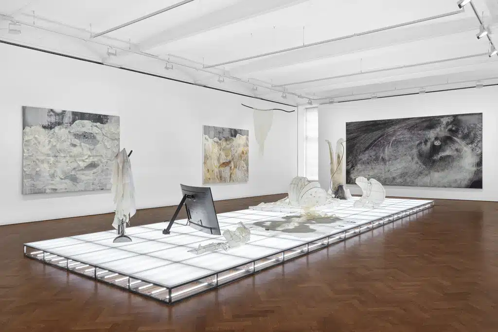 Para sua primeira exposição solo na Thaddaeus Ropac e também a primeira apresentação a ocorrer na Europa, a artista Heemin Chung, baseada em Seul, traz uma nova série de pinturas, esculturas e um vídeo. Suas obras exploram o impacto sensorial de estados transitórios — da escuridão à luz, do virtual ao físico — na cidade em rápida transformação de Seul. Como Chung explica, “Nesta cidade, a tecnologia foi além da mera conveniência; ela alterou fundamentalmente nossa relação com o espaço e o tempo.” Intitulada UMBRA, em referência às sombras profundas projetadas por corpos celestes, a exposição desdobra um mundo de sombras, réplicas e rituais. Esta investigação sobre nossa condição contemporânea inclui uma reimaginação do ritual funerário tradicional coreano Chobun.