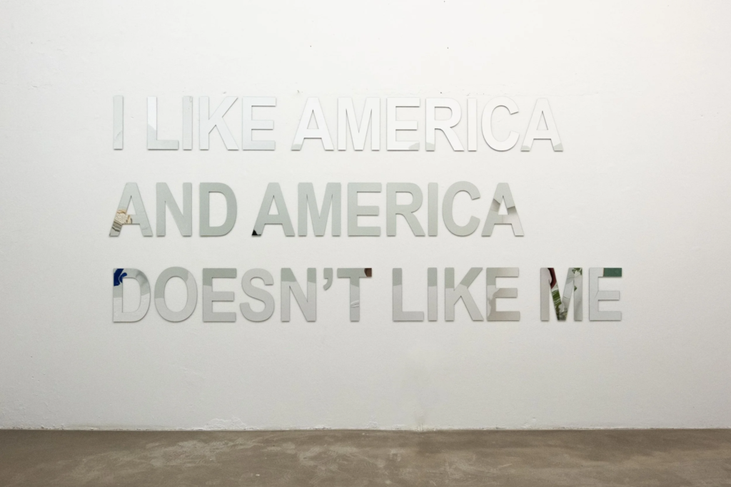 Entre os trabalhos apresentados está “I Like America and America Doesn’t Like Me” (2025), que retoma a célebre performance de Joseph Beuys de 1974 e introduz uma partícula de negação que atualiza a obra no contexto das políticas antimigratórias dos Estados Unidos. Já em “Lessons (after Lucio Fontana)” (2023–2026), Ibarra perfura quadros-negros escolares com munição de arma de fogo, evocando tanto o espacialismo de Lucio Fontana quanto a violência armada em escolas norte-americanas.