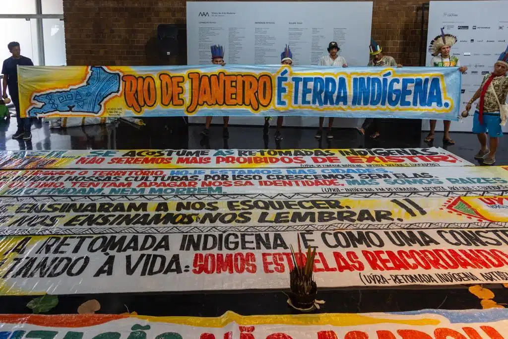 O Supernova, programa de individuais do MAM Rio, recebe até 2 de abril de 2023 a exposição Aqui estamos, de Uýra, com curadoria de Beatriz Lemos. Diferentes vozes, cada uma com seu ritmo e timbre; diferentes rostos, traços, nomes e histórias; fazem todos referência a uma mesma realidade: a dos povos originários deste território que conhecemos como Brasil. A individual reúne múltiplas experiências de pessoas indígenas em diáspora, contadas por meio de sons, imagens e narrativas que se enraízam pelo espaço expositivo do MAM Rio. Em contraponto aos apagamentos históricos perpetuados no presente, as pessoas que aparecem na mostra apresentam histórias raramente contadas e reafirmam sua posição no mundo. Seu modo de existir é, ao mesmo tempo, individual e coletivo, e catalisa tanto o ato de reconhecer quanto o de pertencer. Resultado de um processo de pesquisa e de encontros realizados pela artista em várias regiões do Brasil, as obras iniciam um trabalho de mapeamento e interconexão entre indígenas, principalmente em contextos urbanos, seguindo linhas de parentesco construídas a partir da terra e de contatos possibilitados pelas águas. Uýra é Emerson, 30 anos, indígena da Amazônia Central. É biólogo, mestre em Ecologia, e atua como artista visual, arte educadora e pesquisadora. Mora em Manaus, território industrial no meio da Floresta, onde se transforma para viver Uýra, uma Árvore que Anda. Destaque da 34º Bienal de São Paulo e da Bienal Manifesta!, além de vencedora do Prêmio Pipa 2022, Uýra utiliza o corpo como suporte para narrar histórias de diferentes Naturezas via fotoperformance, performance e instalações. A partir da paisagem Cidade-Floresta, se interessa pelos sistemas vivos e suas violações, com ênfase na memória e diáspora indígena. Seus trabalhos compõem acervos como o da Pinacoteca de São Paulo e do Museu Castello Di Rivoli (Itália).