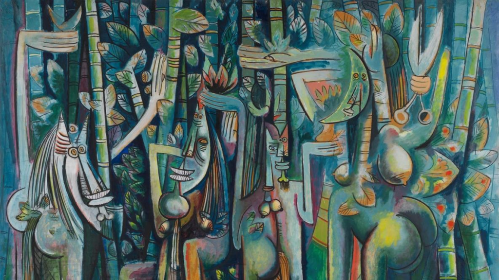 Após viver na Europa nos anos 1930, em meio a conflitos políticos, Lam retornou ao Caribe e passou a reformular radicalmente sua prática. Em suas pinturas, figuras híbridas e paisagens transformadas expressam um imaginário marcado por ancestralidade, espiritualidade e crítica colonial, em um projeto que o próprio artista definiu como um ato de descolonização.
