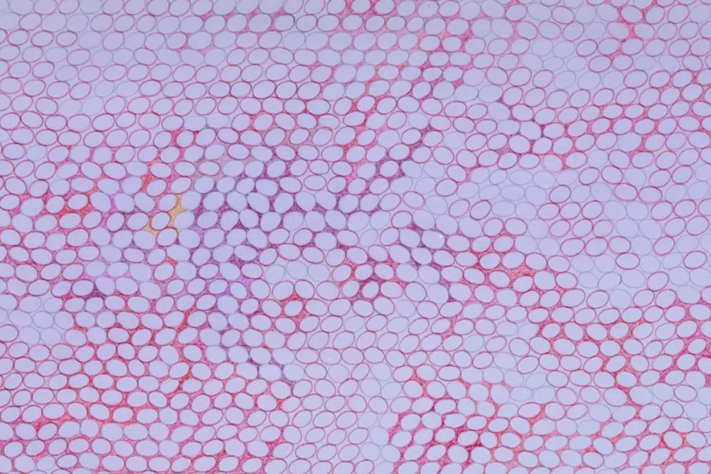 Desde o início de sua carreira, Lou forjou uma visão original infundida de feminismo, desafiando consistentemente e expandindo os limites entre as artes plásticas e aplicadas. Ela criou instalações figurativas do tamanho de salas, esculturas em cores vibrantes e telas minimalistas fascinantes, todas as quais tornam o trabalho radicalmente visível tanto nos registros formais quanto conceituais. Nos últimos quinze anos, a artista voltou seu foco para a abstração e processos repetitivos para se envolver com a história da arte, explorando o potencial conceitual e metafórico de certas dualidades persistentes, como presença e ausência, coesão e desintegração. Cada uma das obras em “Woven” destaca o envolvimento de Lou com a repetição e o foco, bem como sua profunda compreensão da materialidade. Em particular, suas pinturas e desenhos usam caneta e grafite para “tecer” estruturas semelhantes a tecido em uma tela plana, investigando a possibilidade do formato bidimensional para tornar visível o processo de pensamento dentro do trabalho repetitivo.