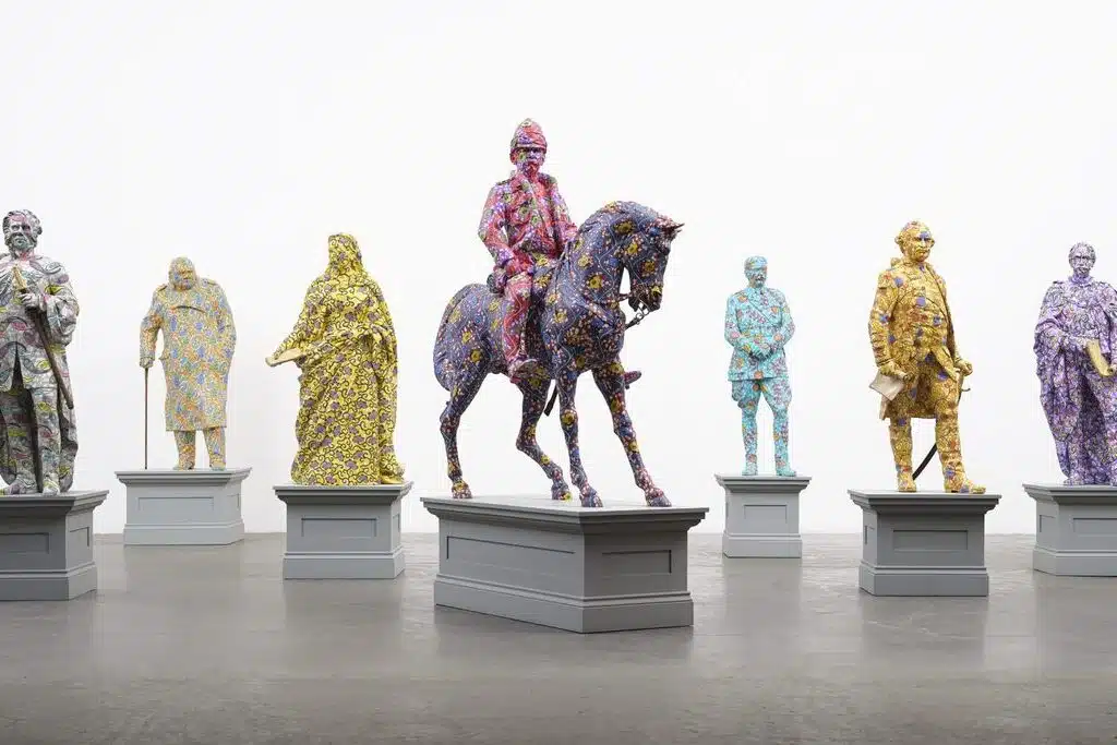 Ao longo da exposição, o uso característico de Shonibare do tecido de cera holandesa simboliza a relação entrelaçada entre a África e a Europa. Esse tecido de cores vibrantes foi inspirado em designs de batique indonésio, produzido em massa pelos holandeses e eventualmente vendido às colônias britânicas na África Ocidental, onde mais tarde foi denominado ‘estampa africana.’ Em “Decolonised Structures” (2022-2023), o artista pinta esses padrões em suas réplicas em menor escala das grandes esculturas públicas de Londres. Reconstruindo figuras coloniais como a Rainha Vitória e Herbert Kitchener, Shonibare questiona o papel e a presença desses monumentos.