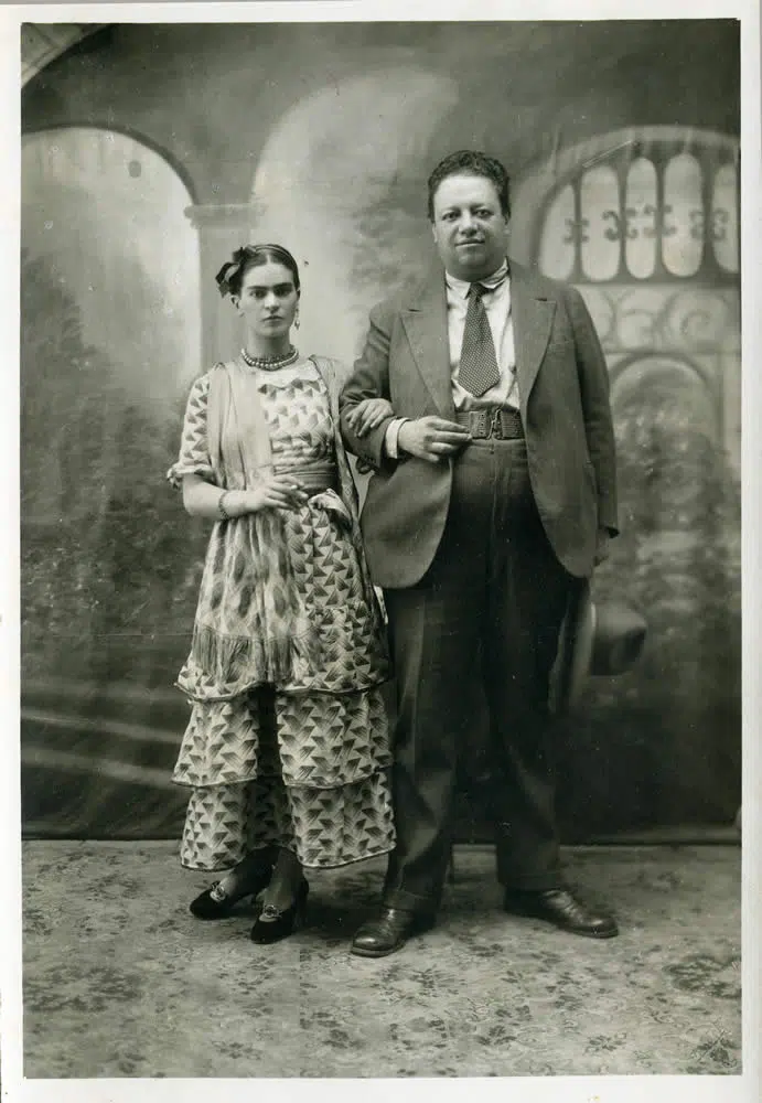 Numa época em que as mulheres não tinham direito a voto e eram educadas para serem uma boa esposa e uma boa “dona de casa”, a artista, desde a celebração de seu casamento, quando ela tinha 22 anos de idade, já apresentava indícios de uma noiva nada convencional. Na cerimônia simples, com a presença única do pai de Frida, ela dispensou o véu, a cor branca e toda a tradição, optando por um vestido comum – aliás, um dos menos luxuosos que ela viria a usar posteriormente – e na fotografia oficial, amplamente divulgada em diversos jornais da época, é vista fumando. No relacionamento, ela também sempre buscou ter uma posição de independência, fazendo questão de dividir as contas. Ainda que o muralista tenha sido um dos nomes mais influentes da época, ela nunca o deixou bancá-la.