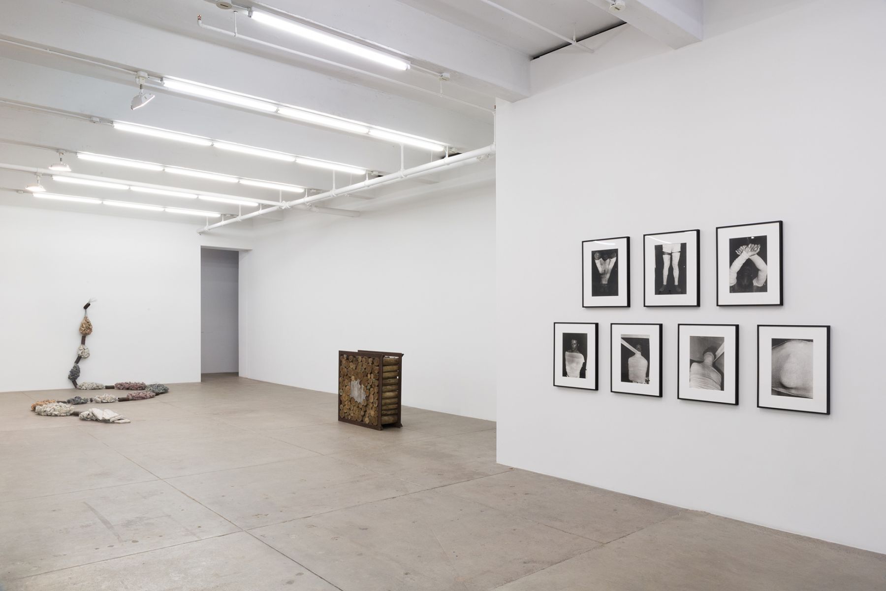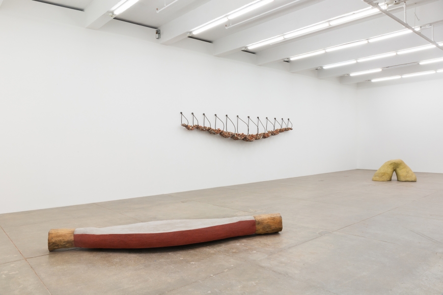 As esculturas de Machado são o cerne da exposição, datadas da década de 1990 até 2007. De aparência brutalista, elas incorporam materiais construtivos crus, como aço, cimento, pedras, madeira e arame, evocando construções e técnicas arquitetônicas, ao mesmo tempo que sugerem formas corporais.