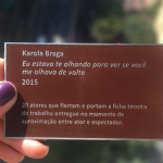 Karola Braga (1988, São Caetano do Sul, Brasil). Prêmios e residências recentes incluem: Kooshk Artist Residency Award (KARA) – Teerã, Irã (2018), Programa de Residência Artística da Cité Internationale des Arts pela Fundação Armando Alvares Penteado – Faap, Paris, FR (2017). Exposições recentes incluem: Sillage de la Reine (artista convidada da 50˚ Anual de Arte) – MAB/FAAP, São Paulo, Brasil (2018), Vozes agudas – Ateliê 397, São Paulo, Brasil (2018), A rose is a rose is a rose – Kooshk, Teerã, Irã (2018), Cette absence bien supportée, elle n’est rien d’autre que l’oubli – Cite Internationale des Arts, Paris, France (2018), Identité com Ricardo Gassent-Centre National de la Danse (CND), Paris, France (2017), Orchidée Rose – Cite Internationale des Arts, Paris, France (2017), Mini Mostra de Arte e Erotismo-Epicentro Jardins, São Paulo, Brasil (2017), Sonhar o mundo: Livres e iguais-Museu da Diversidade Sexual, São Paulo, Brasil (2016), Elza – Laboratório52, SãoPaulo, Brasil (2016), Em oito atos – Estação Satyros, São Paulo,Brasil (2015) 26 ̊Mostra de Arte da Juventude, SESC Ribeirão Preto – RibeirãoPreto, Brasil (2015),Volátil – Museu de Arte Brasileira (MAB/Centro), SãoPaulo, Brasil (2015)