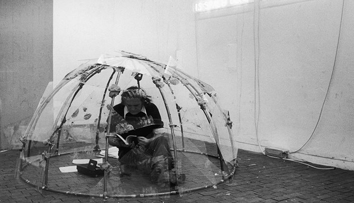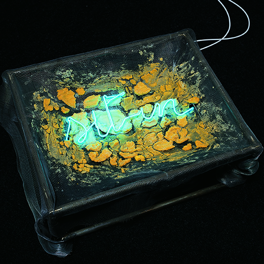 Algumas das obras mais conhecidas de Merz, as peças em neon realizadas entre 1966 e 1969, incluindo “Lancia” (1966), “Salamino” (1969) e “Bicchiere trapassato” (1967), são centrais à exposição. A obra que empresta o nome ao título da mostra, “Sitin” (1968), is displayed in the centre of the main exhibition space, in the form of a sit-in protest.