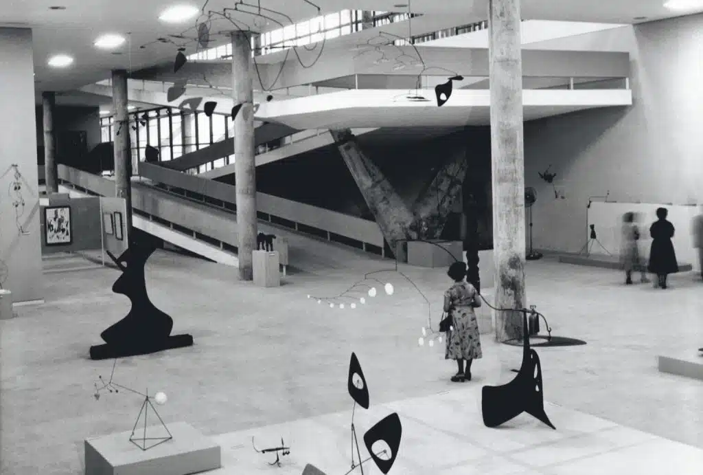 Calder foi fortemente influenciado pela arquitetura moderna brasileira, que conheceu através da exposição “Brazil Builds” no MoMA em 1943. Foi durante essa exposição que ele conheceu o arquiteto brasileiro Henrique Mindlin, que se tornou um importante promotor de sua obra, e o crítico de arte Mário Pedrosa, que escreveu um ensaio seminal sobre o artista, destacando sua intimidade artesanal com a máquina e sua sagacidade no contexto da industrialização pós-guerra.