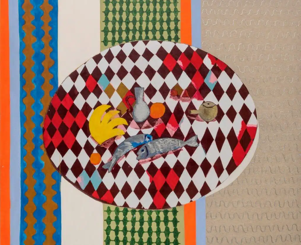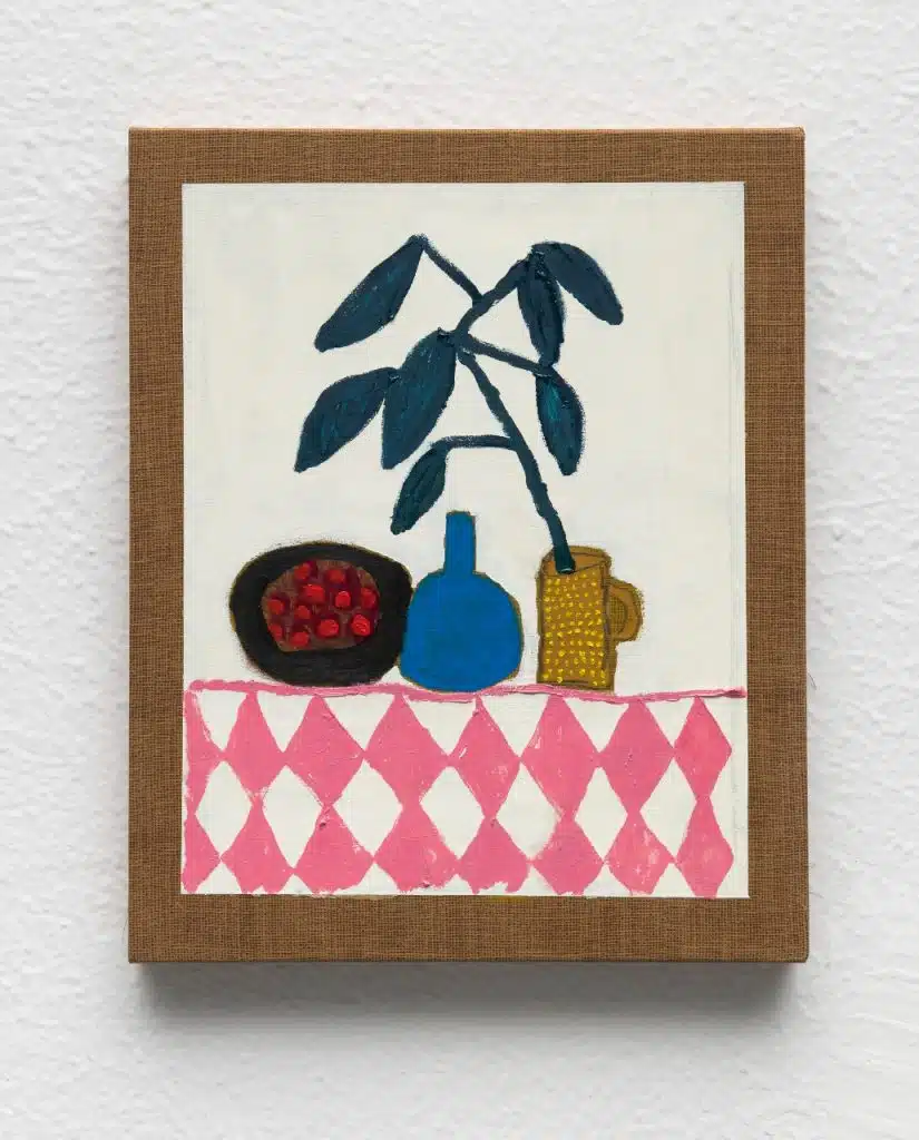 Ela explica que o que vem antes para ela é sempre a matéria: “(…) as muitas possibilidades que a pintura oferece, enquanto coisa, é onde existe um enfrentamento. Ultimamente estou gostando de pintar os potes, frutinhas, etc. Parece que estou buscando uma espécie de de afetividade ou conforto que se expressa nessas pequenas cenas. Olho pra elas como brinquedos, ou às vezes representações de objetos pertencentes a mundos distantes, quem sabe até pré-históricos”.