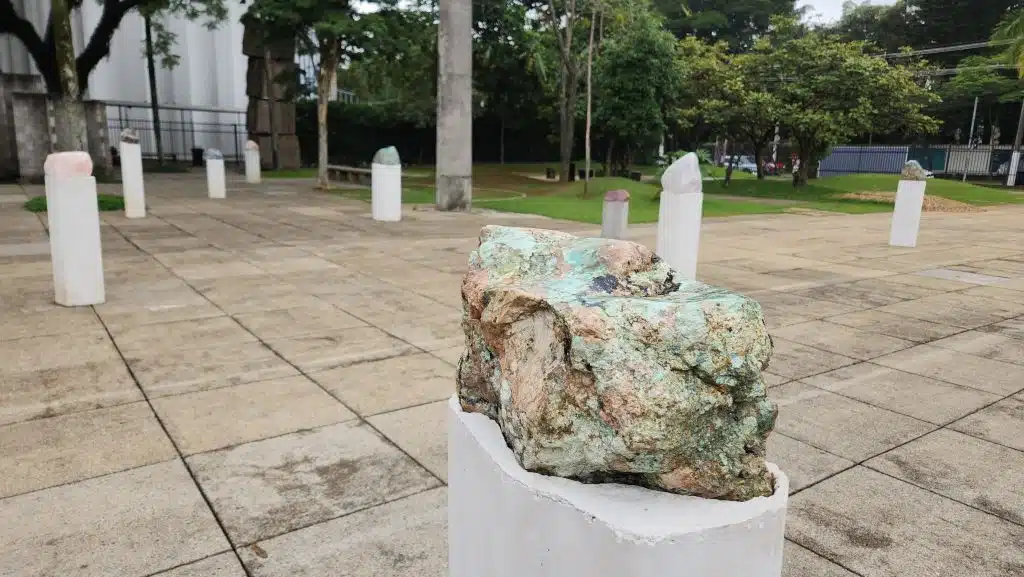 Na área externa do museu, dez pedestais de concreto, de diferentes alturas, sustentam grandes pedras “que trazem a força de debaixo da terra”, como definiu Nara Roesler, fundadora da galeria homônima, responsável pela representação comercial do trabalho de Toledo. Trata-se da série “Impulsos”, pensada para que os visitantes abracem as rochas e sintam suas energias.