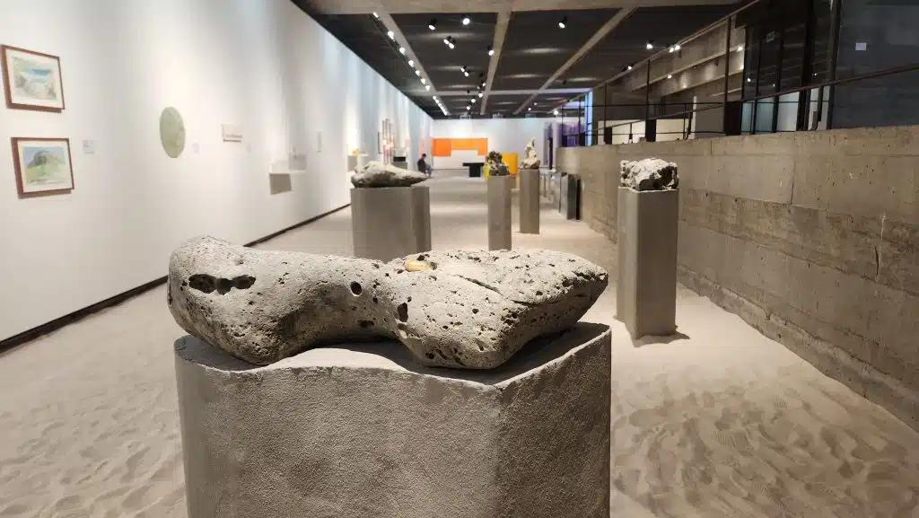 Concebida pelo curador Fernando Limberger e pela geóloga Daniela Gomes Pinto, a mostra panorâmica apresenta cerca de cem obras da artista, incluindo peças inéditas e outras especialmente reeditadas para a ocasião. Um dos grandes destaques é a expografia assinada por Anna Helena Villela, que cobriu quase todo o chão do espaço interno do museu com areia. A proposta dá sequência aos conceitos da artista, envolvendo os trabalhos exibidos com o elemento resultante do desgaste das rochas, e convidando o público a ter uma experiência de passo mais lento, uma vez que a presença da areia impede o deslocamento apressado. Por todos os ambientes estão dispostos bancos produzidos pela própria artista, reforçando o convite ao desaceleramento da curadoria.