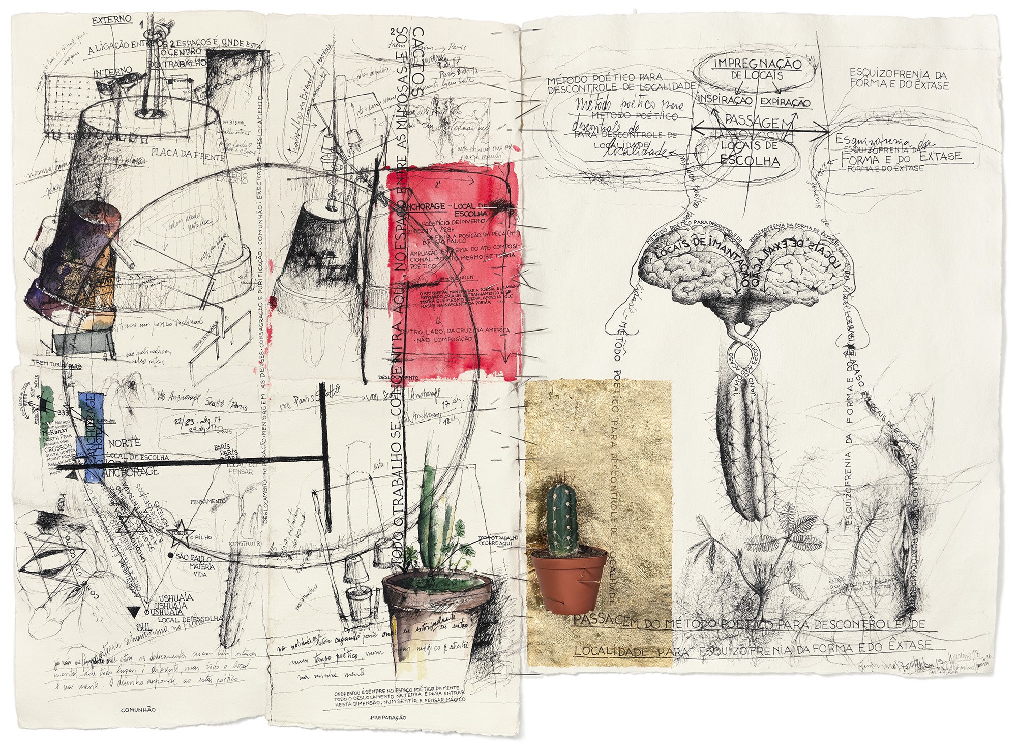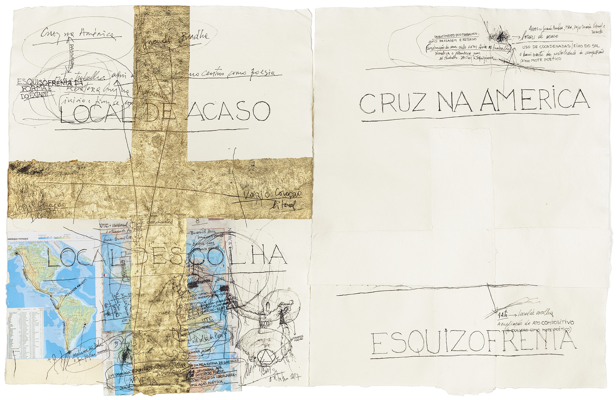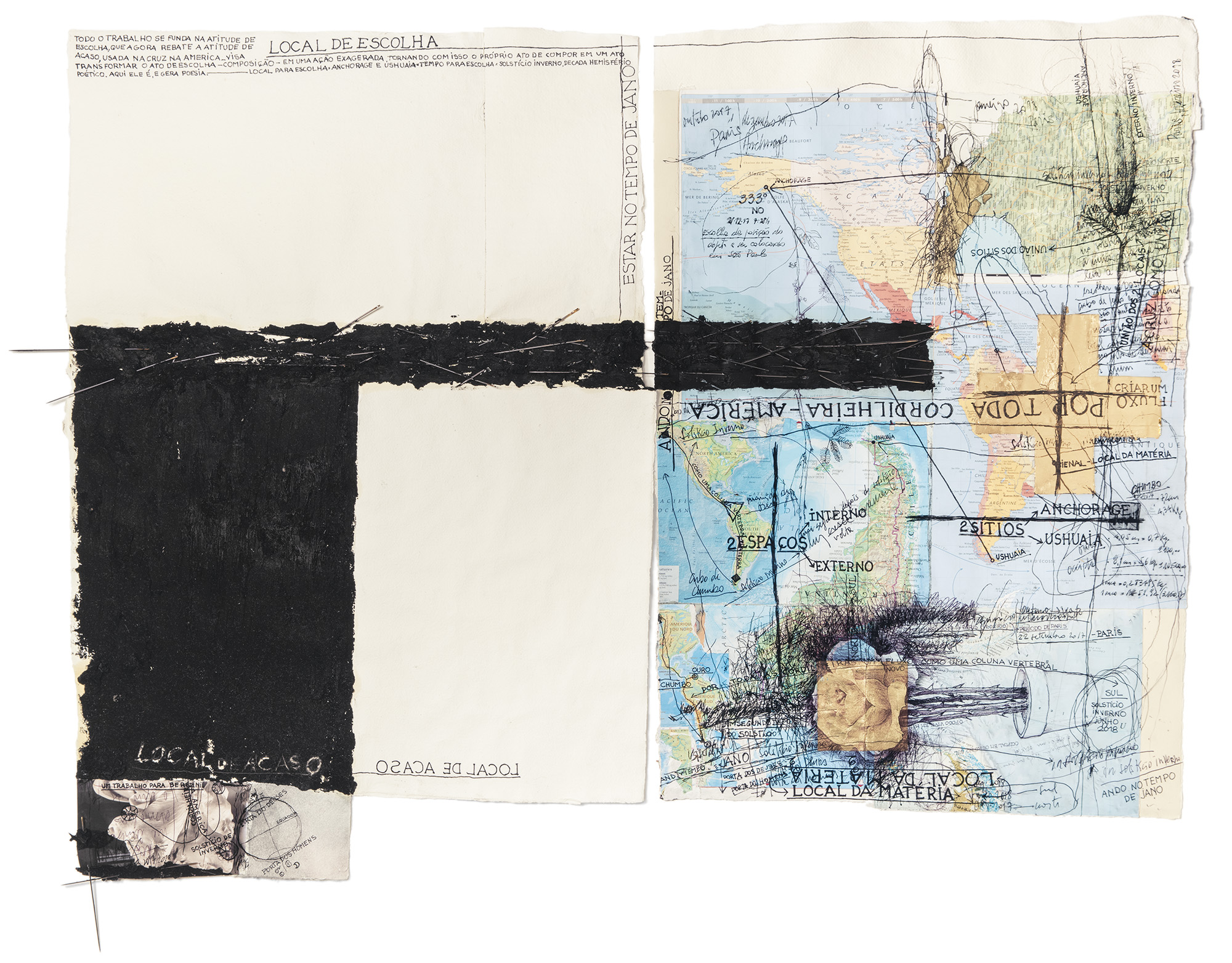 “A escala deste trabalho é composta de três momentos: o primeiro, uma ação em dois pontos da América e, por isso, continental; depois, uma peça sintética colocada em um espaço externo na cidade de São Paulo; e, por último, como efeito de tudo isso, em espaço interno, a série de esculturas realizadas para o prédio da Bienal. Minha percepção de espaço expositivo se caracteriza por um emaranhado de questões, muitas vezes díspares, esquizofrênicas até. O que tenho como espaço, hoje, engloba a poesia e o desenho. Nesse sentido, uso esculturas, objetos, fotografias, ações, coordenadas geográficas, ou mesmo deslocamentos, para construir uma ideia de espaço que, muitas vezes, não recorre só ao local imediato da obra instalada, mas também ao próprio espaço global. Sua natureza não é puramente concreta; sua base é poética. Sua referência não se baseia unicamente na dimensão métrica. Está carregada de percepções, significados, história, sentimentos, desejos, memórias. Um esforço se faz necessário por parte do observador. A obra requer tempo para que você possa tatear e começar a ver sua estrutura. Neste trabalho, fui a dois lugares na América: Anchorage, no Alasca, e Ushuaia, na Argentina, “o início e o fim” de duas cordilheiras que considero uma: a soma das Montanhas Rochosas e dos Andes. Eu as vejo, poeticamente, como uma coluna vertebral do globo terrestre. Nesse exagero de elementos articulados nasce uma noção de paisagem, uma noção de espaço em que se mesclam espaço natural, operações poéticas e espaço construído.”