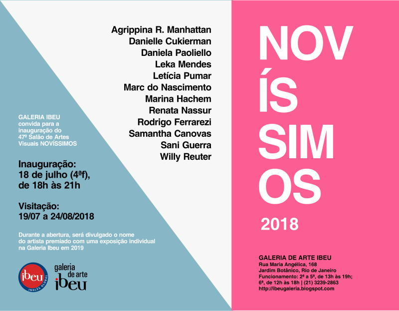 Com curadoria de Cesar Kiraly, a exposição “Novíssimos 2018” deste ano conta com trabalhos em pintura, instalação, objeto, fotografia e desenho de 12 artistas: Agrippina R. Manhattan (RJ), Danielle Cukierman (RJ), Daniela Paoliello (MG), Leka Mendes (SP), Letícia Pumar (RJ), Marc do Nascimento (SP), Marina Hachem (SP), Renata Nassur (RJ), Rodrigo Ferrarezi (SP), Samantha Canovas (SP), Sani Guerra (RJ) e Willy Reuter (RJ). O artista em destaque terá o nome divulgado na noite de abertura e será contemplado com uma exposição individual na Galeria de Arte Ibeu em 2019.