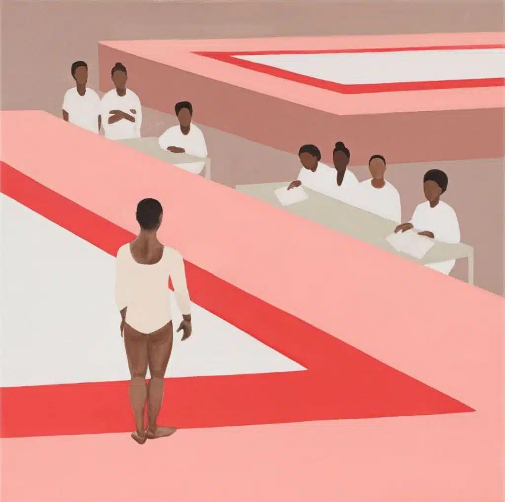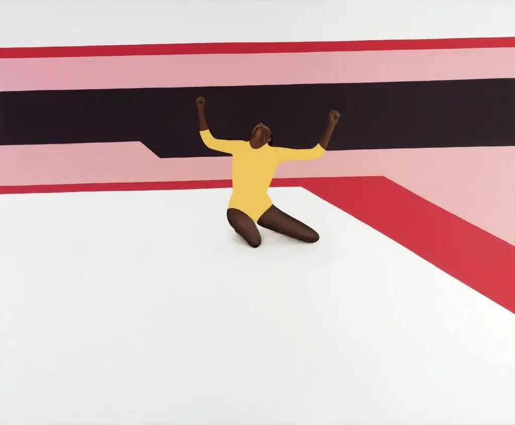 Por meio de suas telas da série “Gymnasium” [Ginásio], Nkosi busca dar protagonismo às ginastas negras, que ao longo da história de um esporte tradicionalmente dominado por brancos, superaram diversas barreiras estruturais, quebraram recordes e se destacaram mundialmente em nome de seus países.
