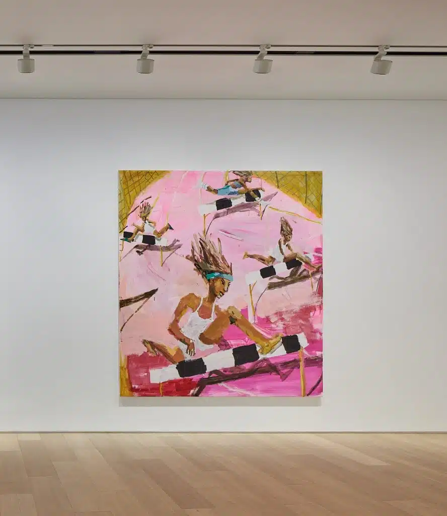 A produção artística de mais de quinze anos de Mie Olise Kjærgaard é conhecida por pinturas que reivindicam a representação feminina, associando-a a imagens de empoderamento e dinamismo. Por meio da grande escala, a artista enfatiza a imponência e grandiosidade das temáticas aos olhos do público. Em “Four in a Row” [Quatro em sequência], com um tratamento expressivo e gestual, a artista captura a energia e a determinação de quatro esportistas saltando obstáculos.