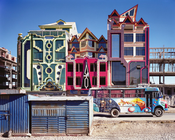 Japonês radicado no Brasil há quase duas décadas, Tatewaki Nio integra a exposição com trabalhos de Neo-andina, série realizada em El Alto, cidade vizinha de La Paz que nasceu como subúrbio da capital boliviana. Pobre, árida e de aspecto quase rural, a região ganha as lentes do fotógrafo por suas grandes edificações kitsch e ultra-coloridas, cujas fachadas contrastam com o monocromatismo do lugar. Projetados pelo arquiteto Freddy Mamani, os edifícios abrigam Salões de Eventos, propriedades de uma burguesia ascendente que, em função da globalização, herda uma estética extravagante típica de lugares como Las Vegas e a impõe em diálogo com motivos locais em um claro símbolo de afirmação identitária e de status social.