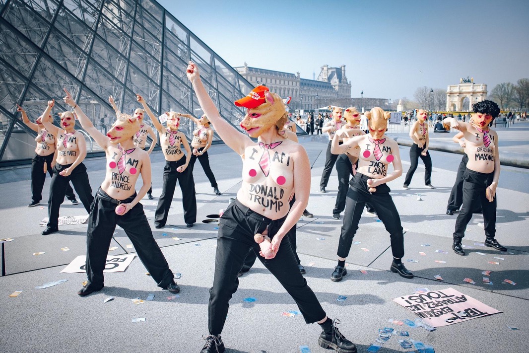 Usando máscaras de porco e colarinhos brancos, as ativistas encenaram uma performance satírica representando figuras da elite política, econômica e cultural que, segundo o grupo, teriam protegido ou ignorado crimes associados ao financista americano Jeffrey Epstein.