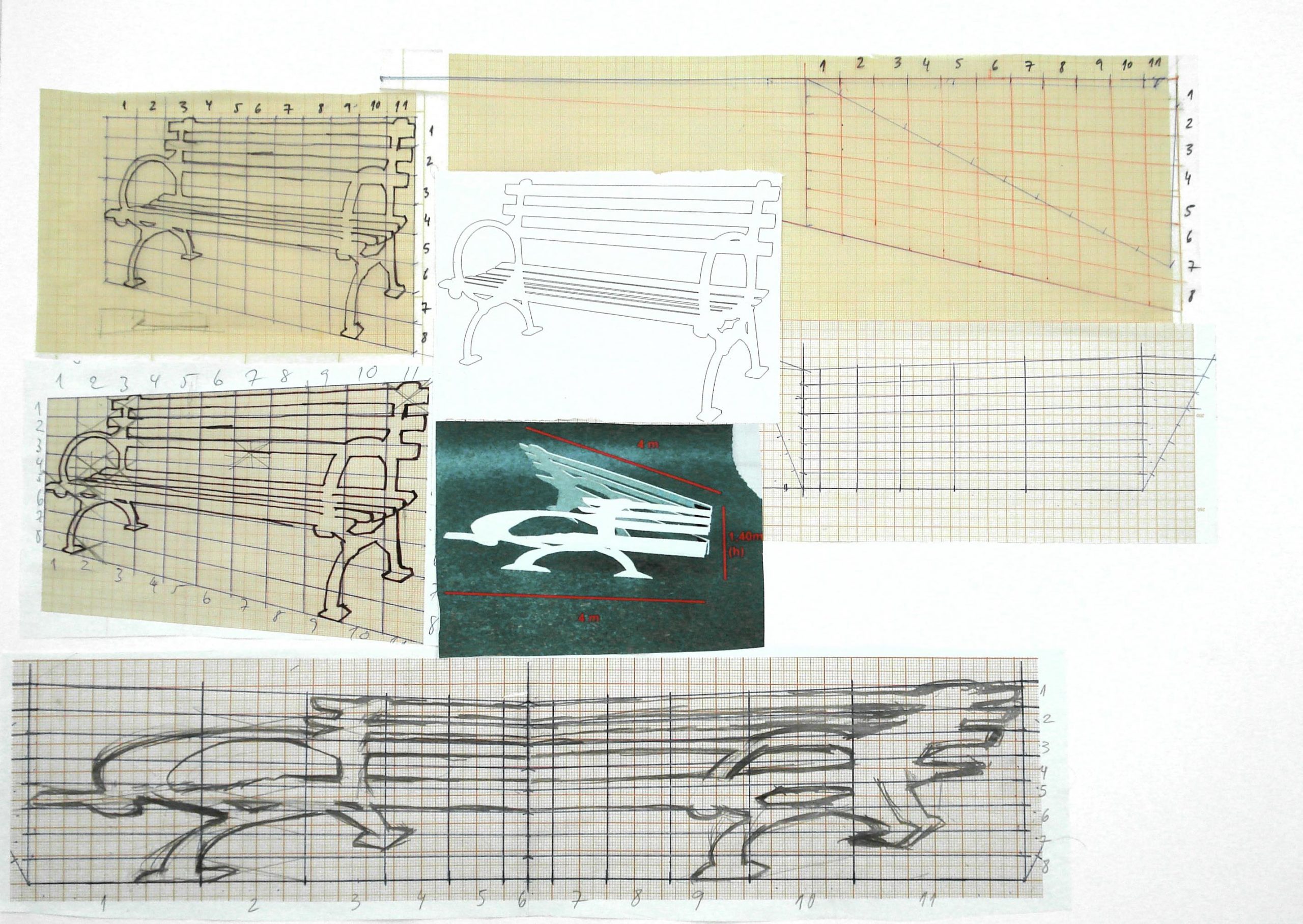 Na obra “Dobra” a artista faz um resgate dos trabalhos que subvertem o sistema de perspectiva que realiza desde os anos 1980, quando, algumas vezes, utilizava imagens originadas a partir de fotografias como na série “Anamorfas” em que objetos cotidianos tomavam, se observados de certa altura ou determinados ângulos, novas formas ou redesenhavam suas imagens rompendo com a ideia de perspectiva linear renascentista. Em “Dobra”, por exemplo, é possível visualizar um banco de jardim na área externa do Paço, a partir de um certo ponto de observação.
