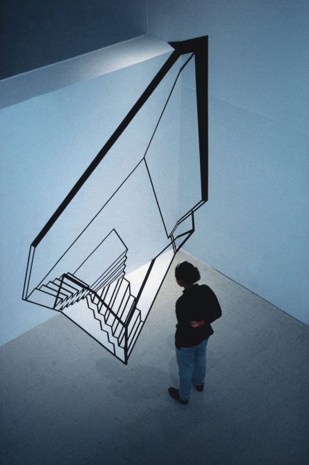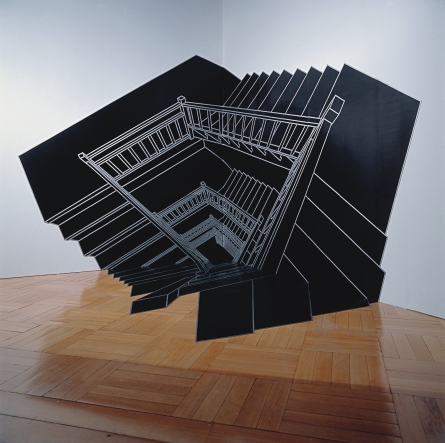 De acordo com a artista, “Há anos venho explorando diversos tipos de ilusões e distorções de perspectiva com base em imagens de escadas, apropriadas de fotos banais que seleciono em revistas e catálogos variados. Inicialmente construí silhuetas com distorções de perspectiva, contidas em “dobras” de espaço de modo a que, conforme o Ponto de Vista do observador, pudessem ser corrigidas. Assim foram as escadas que mostrei na exposição Simulacros (MAC-USP em 1984) e as que pintei na forma de silhuetas, nos dois lados de um vértice de madeira, na vitrine da Franklin Furnace, em Nova York (1988).”