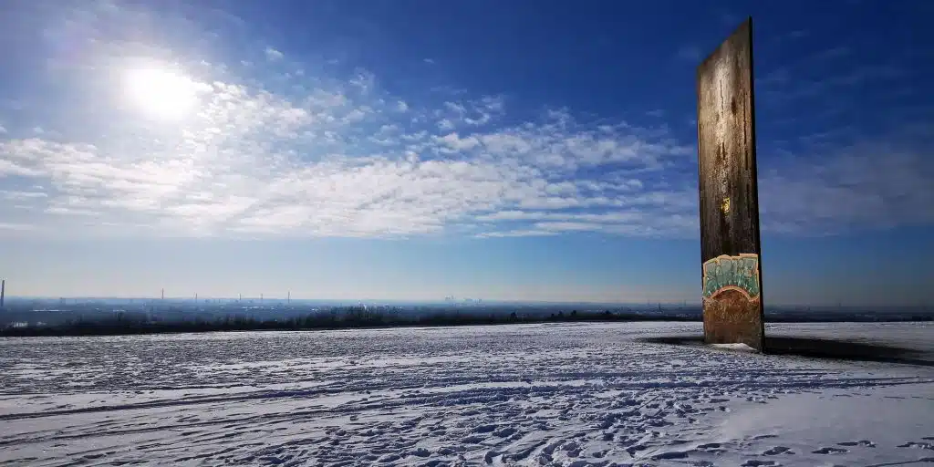 Uma placa de aço de 67 toneladas que se ergue sobre 14,5 metros de altura, foi depositada sob o topo de uma montanha artificial feita de resíduos de mineração, cercada por rodovias movimentadas na região alemã de Ruhr.