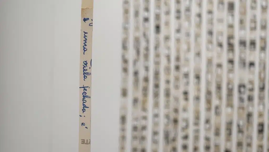 Ao exemplo da série “Prumos”, que consiste em filetes de fotografias penduradas no espaço expositivo e, como o próprio nome indica, com uma pedra pendurada para criar um eixo sólido e fixar ao chão o delicado trabalho. Essas frestas criadas no ambiente rompem com a nossa noção de espaço-tempo. Podemos dizer que as pedras refletem o desejo da artista de fixar essa “ruptura” e o instante em contraponto com a fragilidade do papel fotográfico. Uma metalinguagem da própria fotografia.