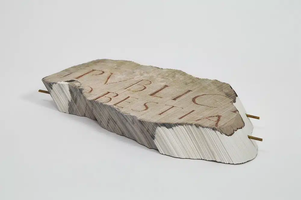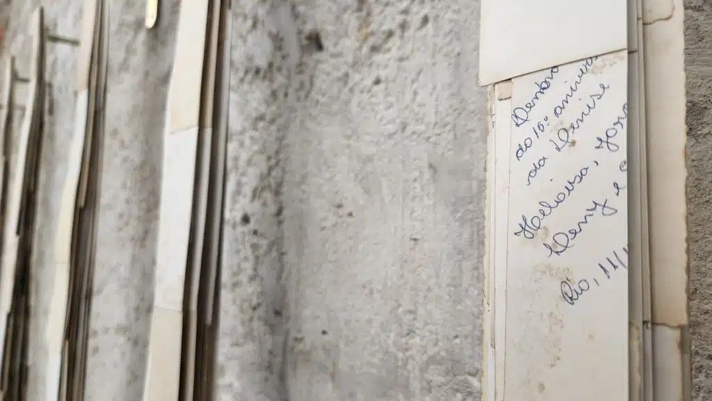 Apesar das fotografias serem de um acervo aleatório que Simone coletou de diferentes lugares sem necessariamente ter contato com as pessoas retratadas, esse distanciamento também pode ser lido como reflexo do contexto em que vivemos. Em contraponto, o tamanho das obras te convida a se aproximar, como se revelasse uma intimidade. A ausência de cores em toda a exposição reforça a ideia de passado e de “sombras”, ao mesmo tempo que cria uma espécie de memorial em homenagem aos falecidos na pandemia. As obras da série “Lapidárium” evocam lápides de fato. E ainda que a figura humana não apareça de forma ostensiva, apesar do título da exposição, é presente ao longo dela toda, sugerindo histórias que se apagaram com o tempo.