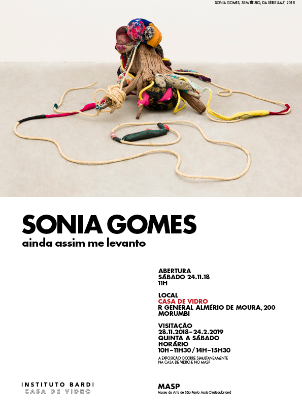No ano em que completa 70 anos, Sonia Gomes ganha sua primeira monográfica simultânea em dois espaços culturais assinados por Lina Bo Bardi: o MASP e a Casa de Vidro, que desafiam a artista a dialogar com a arquitetura modernista. Ainda assim me levanto é o título escolhido pela artista, em referência ao poema “Still I Rise”, de Maya Angelou, escritora e ativista estadunidense reconhecida por sua luta em favor dos direitos civis, sobretudo para os negros e as mulheres. O caráter inédito da exposição vai além de novos trabalhos, e encontra-se na escolha de um dos materiais com o qual ela decidiu trabalhar: a madeira. As esculturas e instalações executadas comumente em tecido envolvem peças de mobiliário ofertados à artista ou encontrados ao acaso, bordadas com minúcia.