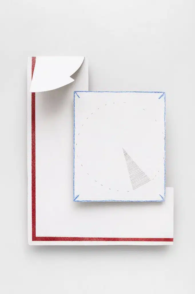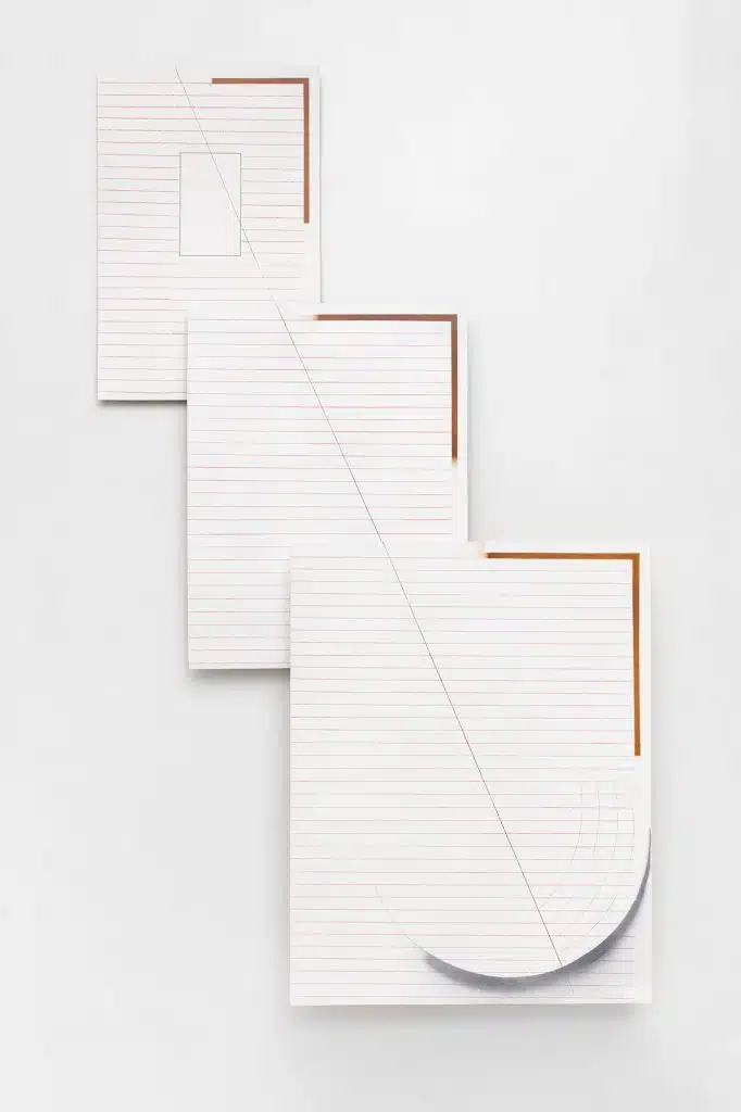 Essa questão da diminuição do que é corpóreo está relacionada também com o isolamento. Isso porque, nas palavras de Muniz, a artista “deixa-se afetar pela falta de experiências sociais, implicando a quase anulação do volume nas obras desta individual”. Embora alguns trabalhos apresentem dobras e sobreposições, essa retirada do volume e o mergulho no que é plano, segundo ela, tem a ver com o desejo de falar sobre outras formas de viver as dimensões.