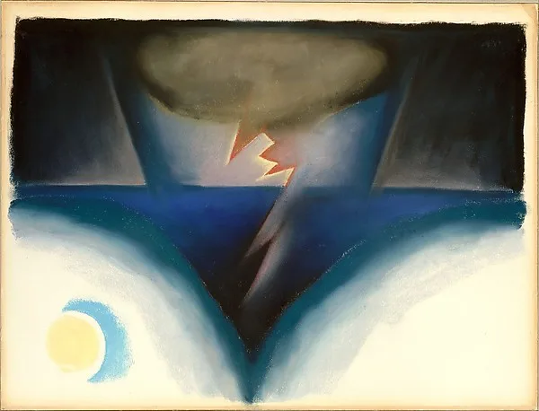A Storm é um pastel suntuoso que captura a visão incrível de uma tempestade elétrica violenta sobre a água. O’Keeffe criou um contraste chocante entre o azul pastel profundo da água e do céu, borrado e aveludado, e o raio agudo e angular de um raio vermelho delineado em amarelo. Esta cena dramática, que ela provavelmente testemunhou no Lago George, inclui o aparecimento surpreendente de uma lua cheia refletida no lago no canto inferior esquerdo. Embora os pastéis de O’Keeffe tenham sido exibidos com frequência durante as décadas de 1920 e 1930, eles representam um aspecto menos familiar de sua obra.