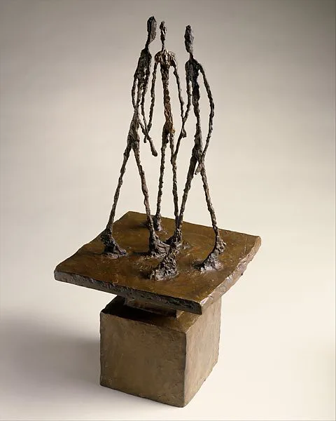 Giacometti nasceu em uma família de artistas suíços. Seu trabalho inicial foi informado pelo surrealismo e cubismo, mas em 1947 ele decidiu produzir o tipo de escultura expressionista pela qual é mais conhecido. Suas figuras características são extremamente finas e atenuadas, estendidas verticalmente até serem meros fragmentos da forma humana. Quase sem volume ou massa (embora ancoradas em pés inchados e grandes), essas formas esqueléticas parecem sem peso e remotas. Seu estranho sobrenatural é acentuado pelos tons foscos de tinta cinza e bege, às vezes acentuados com toques de rosa ou azul, que o artista aplicou sobre a pátina marrom do metal. As superfícies ásperas, erodidas e fortemente trabalhadas de Three Men Walking II tipificam sua técnica. Reduzidas, como estão, em seu núcleo, essas figuras evocam árvores solitárias no inverno que perderam sua folhagem. Dentro desse estilo, Giacometti raramente se desviava dos três temas que o preocupavam – o homem ambulante; a mulher nua em pé; e o busto – ou os três, combinados em vários agrupamentos.