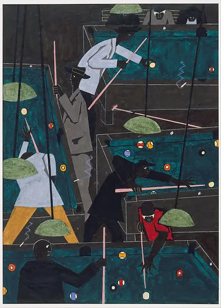 Em 1942, Lawrence, de 25 anos, ganhou reconhecimento nacional quando o Museum of Modern Art de Nova York e a Phillips Collection, Washington, DC, compartilharam a aquisição de sua série de sessenta painéis Migration of the Negro e a enviaram uma turnê de quinze locais pelos Estados Unidos. Mais tarde naquele ano, o Metropolitan Museum comprou sua primeira obra do artista, Pool Parlor, vencedor do concurso “The Artists for Victory”. Pintado com as formas planas características de Lawrence, linhas angulares e uma paleta vibrante, o trabalho retrata um salão de bilhar do Harlem. Homens em poses exageradas, contrastes dramáticos de claro e escuro e o zigue-zague da fumaça do cigarro contribuem para a cena animada.