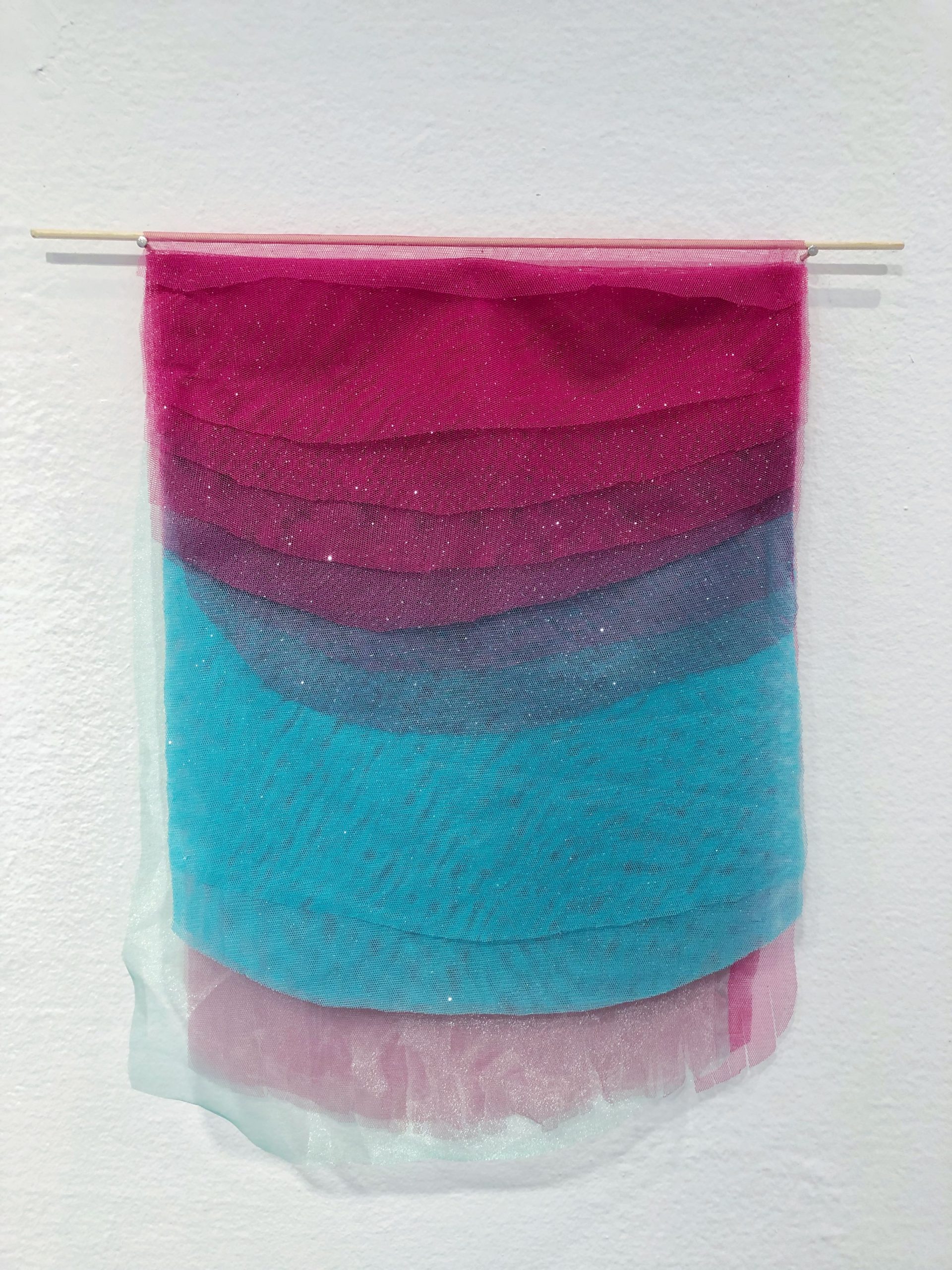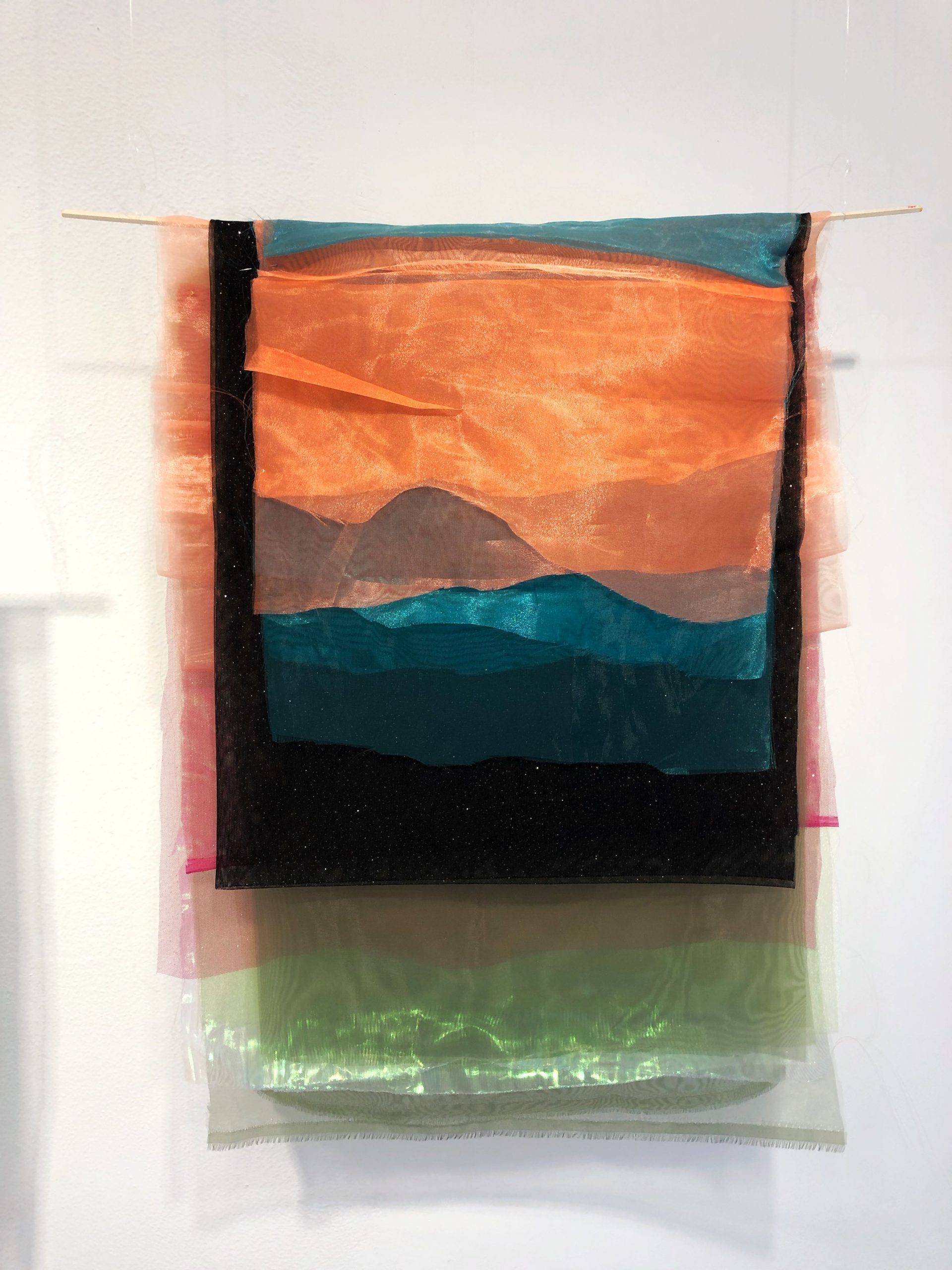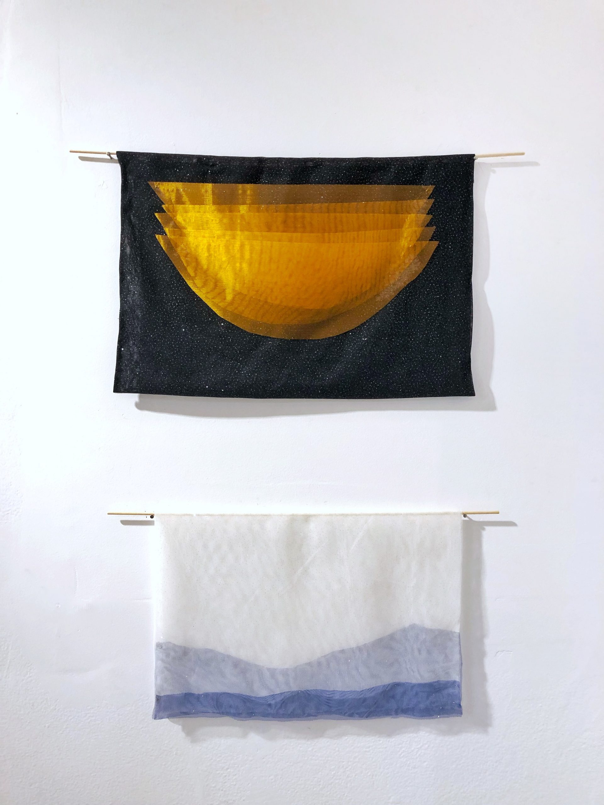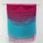 Já a artista Thais Stoklos que traz para a mostra a série “Manhã é quando estou acordada e há uma aurora em mim”, na qual explora as tensões e complementaridades dos opostos dia e noite, luz e sombra, e também lida com diferentes intensidades de energia, de sentimentos humanos. Seus trabalhos se colocam como verdadeiras pinturas feitas por meio da sobreposição de tecidos de diferentes texturas, cores e tramas.
